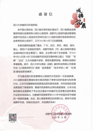 近日,学院收到成都市公园城市建设管理局感谢信。信中对学院大力支持并积极参与2023成都花展表示感谢,同时充分肯定了学院在践行新发展理念公园城市示范区、服务地方和市民方面取得的成效。
