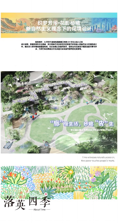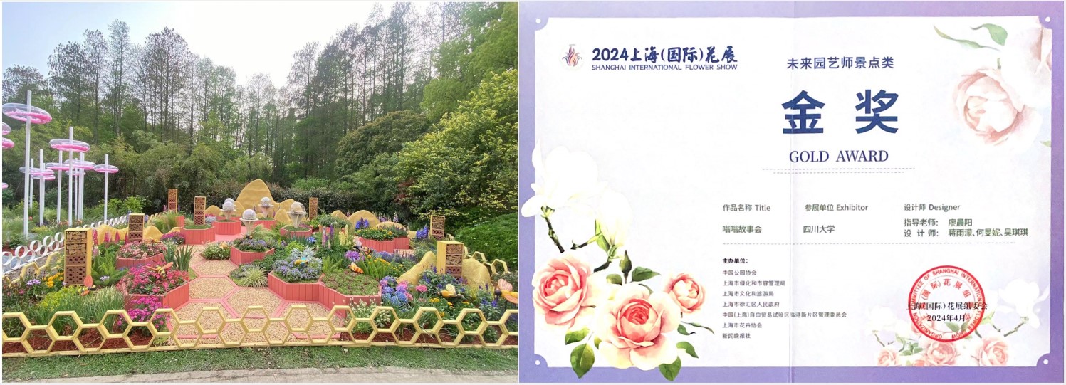 “未来花园设计师”老员工设计竞赛是以2024上海(国际)花展为平台的全国性老员工园林设计类赛事活动,旨在推动高校在生态文明、美丽中国建设等领域的合作交流与专业人才培养,展现“Z世代”未来花园设计师的非凡灵感和对“人民城市”建设的深入思考。风景园林硕士研究生蒋雨濛、何旻妮和吴琪琪的作品《嗡嗡故事会》(指导教师:廖晨阳)荣获金奖,该作品在2024上海(国际)花展落成并向公众展示。