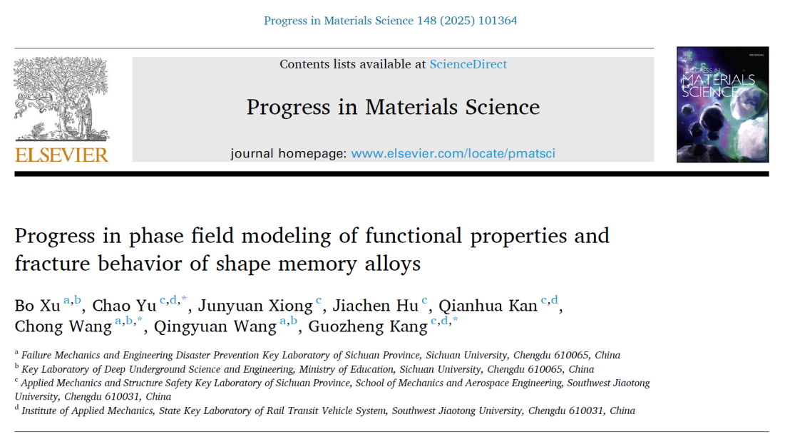 近日,王清远教授团队王宠/徐波课题组在顶级综述期刊Progress in Materials Science(IF = 33.6)上发表了题为“Progress in phase field modeling of functional properties and fracture behavior of shape memory alloys”的论文。学院力学系青年教师徐波为论文第一作者,王宠教授和西南交通大学康国政教授、于超教授为论文共同通讯作者,王清远教授等为合作作者。学院灾变力学与工程防灾四川省重点实验室为论文第一单位及通讯作者单位。