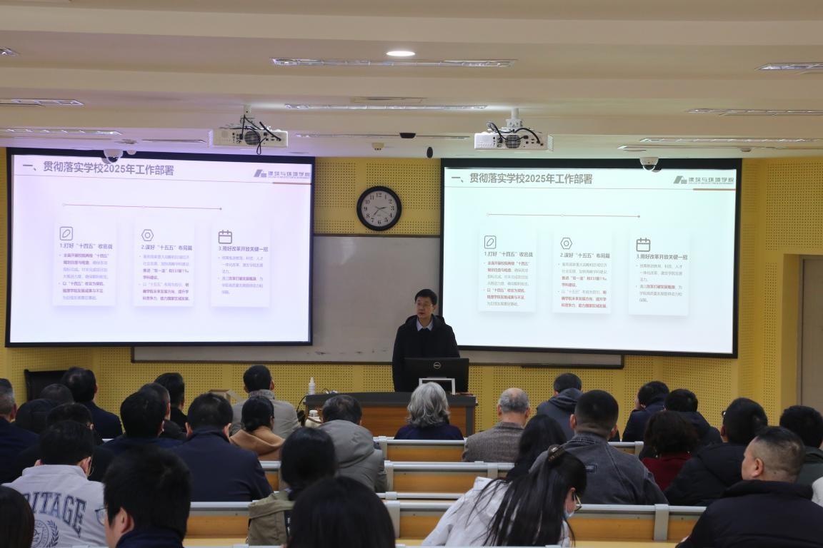 经理戴峰首先传达了学校2025年新学期工作布置会精神。戴峰指出,学院新的一年工作将紧紧围绕打好“十四五”收官战、做好“十五五”布局、用好改革开放关键战略这“三好”展开。针对学院重点工作,戴峰做了安排部署,强调必须坚持立德树人根本任务,全面推进研究生工作,持续强化团队队伍建设,切实提升科研核心竞争力,大力拓展国际合作与交流,促进员工与院地合作,努力打造一流服务保障体系,营造创事干业良好氛围。科学化实施考核调整,不断实现资源优化配置,推进学院各项事业实现一流建设发展,为贯彻落实全国教育大会精神、建设教育强国书写建环篇章、贡献建环力量。