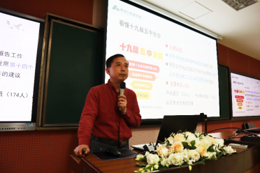 讲座第二部分是蒋文涛书记对十九届五中全会的导读,首先,蒋书记结合两个一百年的历史和现实意义说明了“十四五”规划的重要性,简介此次规划涵盖范围以及编制进程,接着阐述了五中全会的“新形势、新阶段、新理念、新格局以及新目标”,同时还讲解了新时期发展的主张以及基本实现社会主义现代化各方面远景目标,最后蒋书记语重心长从员工发展实例强调关注时事的重要性,希望研究生同学认真学习全会精神,将自身的发展与国家时代的使命结合起来,为建设创新性国家奉献力量。