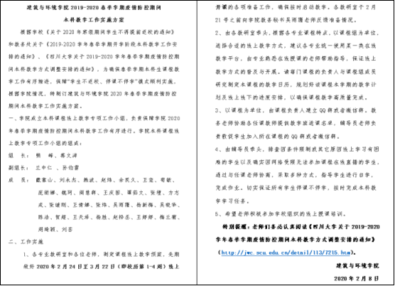 为响应教育部“停课不停学”号召,齐心协力抗击疫情,建环学院高度重视疫情期间教学工作的开展,严格按照学校教务处安排部署,学院领导班子科学规划,以教研室为单位,全面推进疫情期间线上教学工作的组织与实践工作。