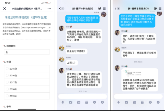 为保证线上教学工作的顺利进行,确保每个细节都按照规定进行,建环学院对课程及教学平台也进行了梳理,如根据课程的设置差异进行了教学形式的分类统计,建议授课老师根据实际进行选用;对超星学习通、爱课堂、雨课堂、QQ群、微信群、慕课平台等教学平台也进行了试用,总结平台优缺点供授课教师参考。2月17日,学校教务处在综合教务系统中公布课程联络群后,建环学院立即着手跟踪员工加群情况,及时发布未能加入课程群的反馈问卷,收集不能成功加群的课程信息,通过教务处工作群与各学院的同事积极配合,联络任课老师帮助每一位员工顺利加群