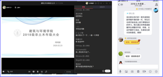 辅导员们利用QQ群课堂,直播平台,微信语音视频等各种网络媒介召开了一次别开生面的年级大会。线上,辅导员们化身为网络主播,主持风格迥异,或润物无声,或妙语连珠,或慷慨激昂。拉家常,发表情,论时况,师生互动频繁,氛围好不热闹和谐……围绕防疫与教学,辅导员们指出了几点注意事项及学校要求。