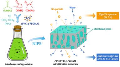 论文基于汉森溶解度参数理论计算,使用绿色溶剂二甲基亚砜(DMSO)按照一定比例替代传统有毒溶剂制备聚氯乙烯/聚氯乙烯-接枝-聚乙二醇甲基丙烯酸酯共混超滤膜,并系统研究了绿色溶剂二甲基亚砜对超滤膜性能的影响及其机理。这是首次将绿色溶剂引入聚氯乙烯超滤膜的制备,既减少了环境污染,又极大提高了超滤膜的性能。I&EC R是美国化学协会(ACS)旗下的期刊,创刊已有110年,是化工领域的顶级期刊,川大B级期刊。