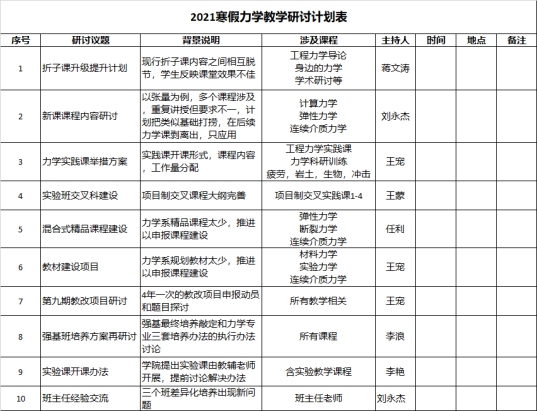 力学系20余名教师通过线上线下相结合的方式参加了本次主题教学研讨活动。老师们积极发言,提出问题和见解,聚焦共性问题,成效较为突出。老师们纷纷表示,此次教学研讨活动为力学系课程建设提供了诸多思路,同时也为后期开展更多教学研讨活动奠定了基础。