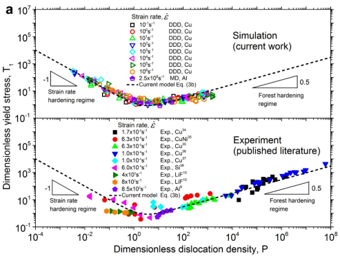 研究团队运用大数据研究方法,开展了194个位错动力学模拟,位错密度跨9个量级,应变率跨10个量级。无论是运用模拟手段还是实验手段,如此大尺度的研究并不多见。大数据模拟成果有力地证明了材料强度相对位错密度并非单调变化,而是呈现出先降后增的两个阶段,其中第二阶段为传统的Taylor强化机制,而第一阶段为应变率强化机制,充分证实了低位错密度材料的超高强度。基于位错机制和基本理论分析,研究团队提出了巧妙的位错速度求解思想,首次建立了位错密度和速度之间的数学模型,实现了描述位错密度、应变率和材料强度之间物理关联的解析理论,并与194个模拟数据和136个实验数据吻合。该成果不仅探明了全新的位错强化机制,且增进了位错理论的基本内涵,也为晶体塑性理论开拓了新思路。