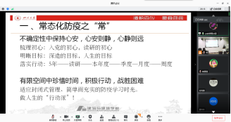支部书记高倩讲授了“严守法纪 积极乐观——常态化防疫,向我看齐”的专题微党课。她介绍了当前国内外疫情防控形势和学校员工返校工作的开展情况,然后紧密围绕习近平总书记关于疫情防控工作的重要讲话和指示批示精神,从常态化防疫之“常”、常态化防疫期间的法律纪律、常态化防疫的身心建设、防“疫”向我看齐四个主题切入,引用真实案例,向全体支部党员讲解了疫情防控常态化中党员同志承担的责任和使命。高倩要求同学们以实际行动进积极响应党和国家号召,勇担时代责任,刻苦学习、献身科研,充分发挥党员先锋模范作用,确保打赢疫情防控阻击战。