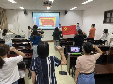 为庆祝中国共产党99华诞,进一步强化党员教育,充分发挥员工党员的先锋模范作用,学院研究生环工一支部全体党员于2020年7月8日上午在明德楼128多媒体教室通过线上线下相结合方式,开展了以“庆党的生日、讲战疫故事、悟初心使命”为题的“七·一”主题党日活动。