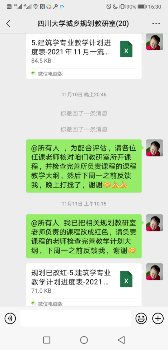 四、2021年11月10日,协助建筑学专业评估、毕设开题及准备、大创评审、教材审查、宣传突发疫情防控通知,见下图: