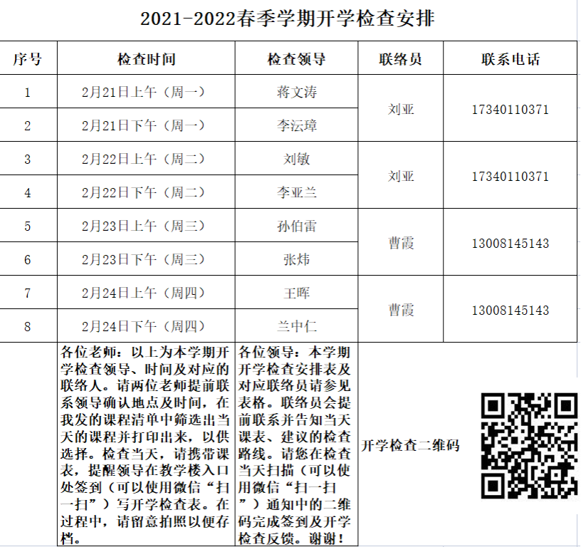 在正式开始行课前一周,学院教学管理人员通过电话、工作QQ群、工作微信群、短信等方式提醒任课教师再次核实上课时间、地点,安排教学检查工作,保证师生平稳进入上课状态。