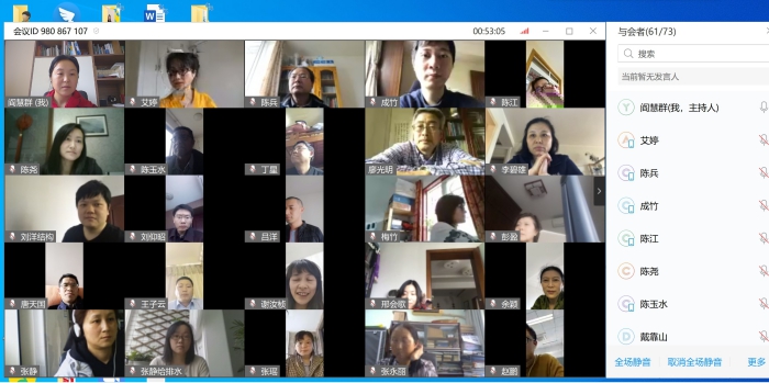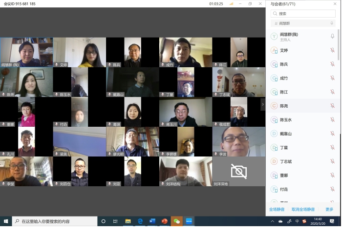 2020年3月6日,土木工程系在阎慧群老师通过腾讯会议线上平台组织学习了《关于2019-2020学年春季学期开学阶段本科教学工作安排的通知》。学习人员包括:熊峰,戴靠山,李章政,蒋玉川,丁星,刘洋,丁志斌,阎慧群,葛琪,陈江,艾婷,石宵爽,张朝鹏,唐天国,向安田,廖光明,游翔,张瑶,李碧雄等等结构教研室35名老师。阎慧群老师传达了《2019-2020学年春季学期开学阶段本科教学工作安排的通知》的通知和要求,并针对关于新学期课程在线教学准备和进展情况,毕设等各项工作情况展开研讨。